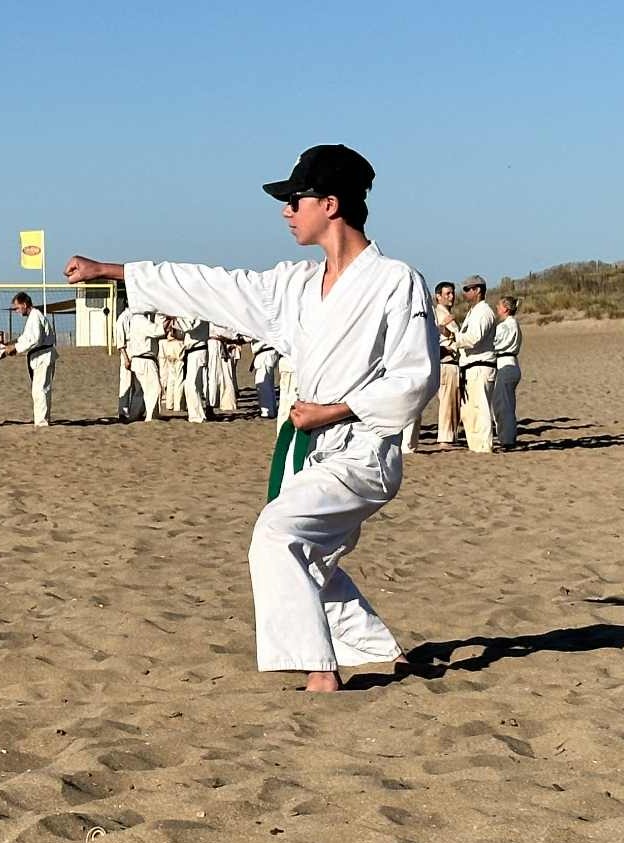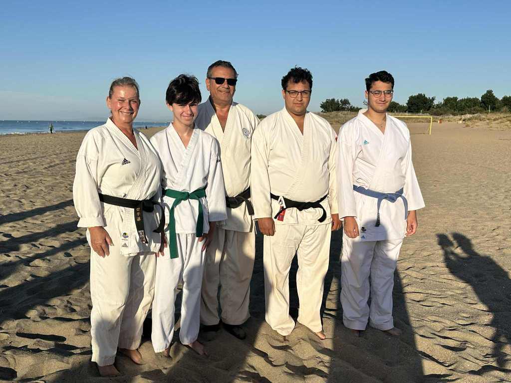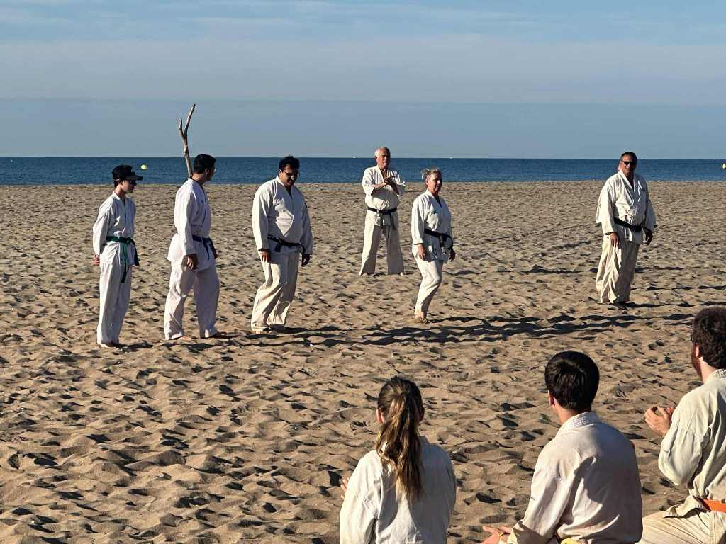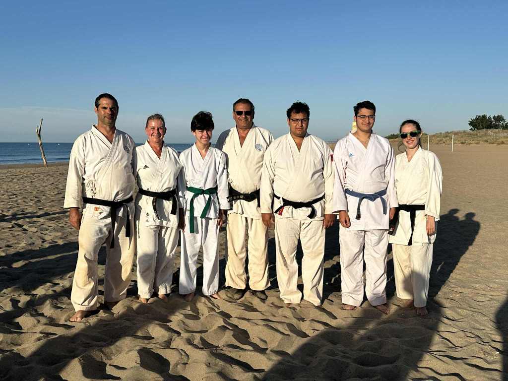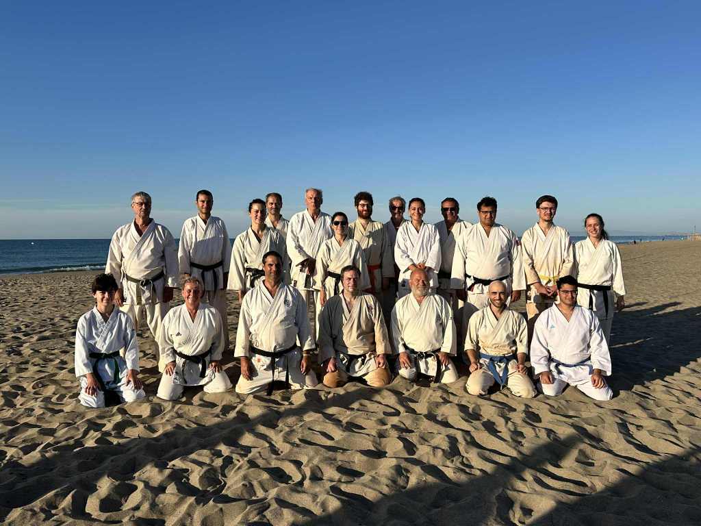 Nouvelle édition du traditionnel stage national KDSE à Serignan, instauré par Maître Murakami en 1969, qui a eu lieu du 7 au 11 juillet 2025. En compagnie de nos amis des clubs français de KDSE et suisses de SKS, nous avons retrouvé la sérénité des entraînements matinaux sur la plage, au soleil levant, et la chaleur tombante des cours de fin d’après-midi, les pieds « légers » effleurant le sable chaud. Ce stage, sous direction collective, nous a permis de travailler les fondamentaux du Karate Shotokaï et de partager nos expériences et nos pratiques entre clubs amis.